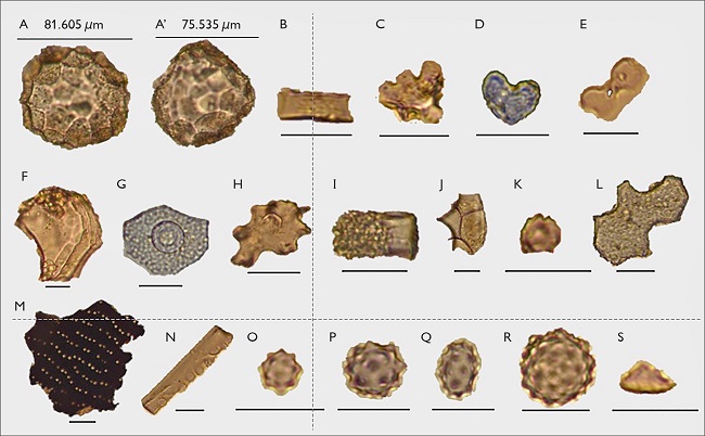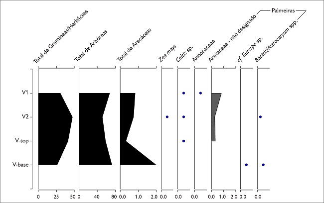 Sob a vasilha 2, também foi registrada a predominância de fitólitos de arbóreas ( ca. 51,5%), somadas a baixas proporções de Arecaceae e de Celtis sp. (média < 1%). Entre as herbáceas, fitólitos produzidos por Asteraceae foram os mais frequentes (25%), seguidos por Poaceae (18%) e por pequenas quantidades de Marantaceae (3,5%), Cyperaceae e Oryzeae (< 1% cada). Adicionalmente, um fitólito de milho foi identificado nessa amostra. Considerando-se a ausência de Asteraceae nas outras amostras provenientes do contexto de vasilhas enterradas, a abundância de seus fitólitos nesta amostra possivelmente resulta da deposição intencional de alguma planta desta família abaixo da vasilha 2 ou de bioturbação; as amostras provenientes da vasilha 2 apresentam assembleias fitolíticas similares, mas com proporções distintas na base e no meio da vasilha. Fitólitos de arbóreas predominaram tanto na base (72,5%) quanto no meio (58%), seguidos por Poaceae (22% na base e 38% no meio), enquanto Arecaceae (média de 1,5%), Marantaceae (1,5-2%), Cyperaceae (média < 1%) e Celtis sp. (< 1%) ocorreram em baixas quantidades ( Alves, 2017).