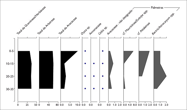 Arbóreas (variação: 61-66%) dominam as assembleias de fitólitos provenientes do perfil de referência (TP1) com pequenas proporções de Annonaceae (média: 1%) e de Celtis sp. (<1%), os quais, somados às Arecaceae (2-9%), indicam cobertura vegetal fechada no latossolo do sítio Cedro ( Figura 7). A proporção de Arecaceae aumenta da base para o topo do perfil, em detrimento de variações nas herbáceas. Cabe ressaltar que os morfotipos de Arecaceae mais frequentes são os de Mauritiinae/Euterpeae, seguidos por Attaleinae e Bactris/ Astrocaryum spp. Portanto, todas as Arecaceae representadas são plantas úteis tanto como alimento quanto como matéria-prima; as Attaleinae também são consideradas indicadoras de perturbação na estrutura vegetal. Annonaceae e Celtis sp. também são comestíveis e indicadoras de floresta secundária ( Knüpffer; Hanelt, 2001; Levis et al., 2017). O aumento nas Arecaceae, em conjunto com a constante presença de Annonaceae e Celtis sp., sugere intervenção humana na vegetação do entorno do sítio Cedro, fora do solo antropogênico. Esse impacto na vegetação no entorno de sítios arqueológicos também foi observado na FLONA Tapajós ( Levis et al., 2017, 2018; Maezumi et al., 2018a), bem como em outras partes da Amazônia ( Lins et al., 2015; Quintero-Vallejo et al., 2015). Entre as herbáceas (33-37,5%), as Poaceae (11-29,5%) são mais abundantes e também incluem Marantaceae (variação: 3,5-9,5%), Asteraceae (1,5-8,5%) e Cyperaceae (< 1%).