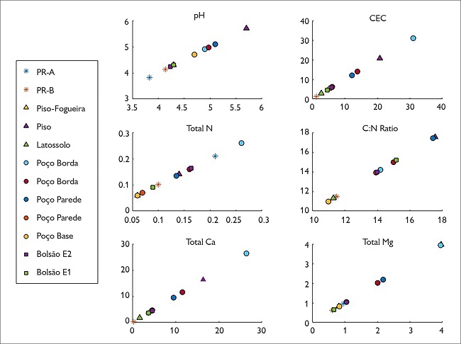O antrossolo do bolsão apresenta variações de acordo com os dois eventos formativos. Na parte inferior, o solo é extremamente ácido (pH entre 4,1-4,5) e com maior toxicidade. Todas as variáveis (CTC, saturação por bases, razão C-N, acúmulo de matéria orgânica e concentração de elementos e nutrientes) apresentam valores menores do que a parte superior. A camada superior (terra marrom) apresenta pequeno aumento em todas a variáveis, particularmente nos teores de nutrientes (Zn, Mn, Mg e K) resultantes de resíduos de queima ( e.g. cinza e carvão) e da decomposição de restos de planta ( Figura 11). Adicionalmente, os baixos teores de Ca e de P são consistentes com a ausência de ossos macroscópicos durante as escavações e reforçam a ausência de ossos microscópicos.