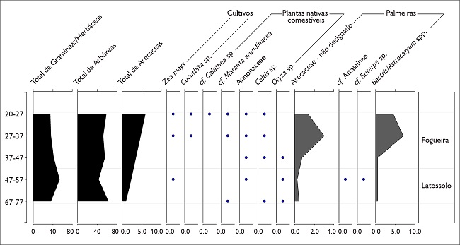 Consistente com o contexto de queima e com a grande quantidade de carvão, fitólitos de arbóreas aumentaram (média de 61%) nas amostras da fogueira. Além disso, a proporção de Poaceae diminuiu (média de 20%), enquanto a de Marantaceae aumentou (média de 12,5%). Como mencionado, entre as Marantaceae foram identificados fitólitos de cf. araruta e cf. ariá, registrando o consumo dessas raízes no Cedro em concomitância com mandioca, milho e abóbora, todos presentes no contexto de cozimento. Adicionalmente, foram recuperados fitólitos de outras plantas nativas comestíveis ( e.g. Annonaceae, Arecaceae, Cyperus sp., Celtis sp.). Entre as Arecaceae (média de 8%), os fitólitos produzidos por pupunha/tucumã foram mais abundantes (6%). A maior presença de fitólitos de palmeiras é consistente com a grande quantidade de sementes carbonizadas de palmeiras, coletadas na fogueira durante as escavações. A predominância de fitólitos de pupunha/ tucumã indica o favorecimento dessas palmeiras comestíveis pelos habitantes do Cedro. A decomposição de todos esses recursos vegetais contribuiu com o enriquecimento do solo nesse contexto.