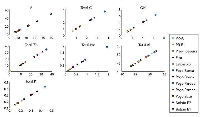 O pH mede a acidez e o teor de Al 3+ indica a toxicidade do solo. Solos muito ácidos apresentam elevadas taxas de Al 3+ e, portanto, são também mais tóxicos para o desenvolvimento de plantas ( Falcão et al., 2009). A CTC e a saturação por bases (V) medem a fertilidade e o potencial produtivo do solo, pois indicam a retenção e a disponibilidade de macro (Ca, Mg, K e Na) e de micronutrientes (Zn e Mn) no solo ( Madari et al., 2009). A razão C-N mede a estabilidade da matéria orgânica à decomposição, solos mais estáveis são mais resistentes à degradação e têm maior capacidade de acúmulo de nutrientes. Múltiplas funções no solo são condicionadas pelos teores de matéria orgânica (MO), entre as quais equilibrar a CTC, a retenção de água e a estabilidade do solo (razão C-N). O carbono e o nitrogênio são indicadores dos conteúdos de matéria orgânica no solo ( Woods, 2009), como evidenciado acima, a MO foi estimada com base no teor de carbono total. O teor de P total e disponível é um indicador-chave de contextos antropogênicos que também é útil na distinção entre áreas de atividade ( Woods, 2009).