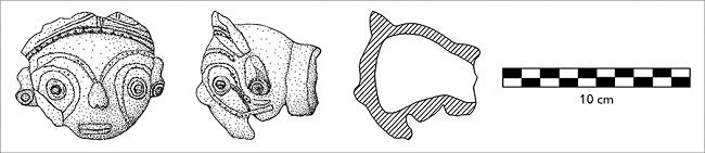 Esse bolsão foi parcialmente escavado através das unidades 6 e 9. O primeiro evento de formação caracteriza-se pela deposição de uma cabeça antropomorfa modelada de estilo Santarém, com poucos fragmentos cerâmicos na base do bolsão. Este fragmento pertence provavelmente a um vaso globular, característico das louças cerimoniais da cultura Santarém ( Figura 12). A sua iconografia apresenta um indivíduo usando alargadores de orelha, o que é um atributo de prestígio geralmente presente nas figuras das louças cerimoniais. Como já mencionado, um alargador de orelha em hematita foi encontrado no contexto doméstico, abaixo de uma das vasilhas enterradas. O segundo evento apresenta mais vestígios materiais depositados em solo antropizado. A cultura material associada ao evento de reabertura é caracterizada por vasilhas grandes e decoradas para servir alimentos, muitas vasilhas para cozinhar alimentos, trempes e pedras fissuradas pela exposição ao fogo, o que é uma prática utilizada no preparo de alimentos ( Oyuela-Caycedo, 1995). Existem outras evidências de combustão na área, tais como abundância de carvão, fragmentos de cerâmica queimados e um fragmento estourado por choque térmico.