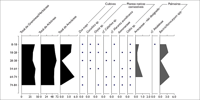 A predominância de fitólitos de arbóreas em todo o perfil é consistente com os demais contextos analisados no sítio ( Figura 13). No primeiro evento, os fitólitos de arbóreas constituem 60% (Arecaceae – 5,5%) das amostras, enquanto herbáceas constituem 40% (Poaceae - 28%). A assembleia de fitólitos da lente de latossolo adicionada aos 54-64 cm apresentou pequenas variações nas proporções de arbóreas (57% - Arecaceae ausente) e herbáceas (42% - Poaceae com 32%). Enquanto, no segundo evento, herbáceas diminuem (35,5% - Poaceae com 23%) e arbóreas aumentam (63% - Arecaceae com 2,5%), também coerente com a abundância de carvões no topo do bolsão. Seis fitólitos de abóbora foram identificados nesse evento. A distribuição de palmeiras também mostra uma distinção clara entre os dois eventos de formação do bolsão. Completamente ausente nas amostras provenientes da lente de latossolo, ou seja, exclusivamente associado aos dois eventos formativos, o morfotipo de pupunha/tucumã aparece em maior proporção no primeiro evento (4,5%) do que no segundo (2%). Os demais morfotipos ocorrem em baixíssimas proporções em ambos eventos. Similar à área de cozimento, o registro de fitólitos indica maior descarte de pupunha/tucumã no bolsão, corroborando a interpretação de preferência por essas palmeiras no sítio Cedro. Baixas proporções de Celtis sp. foram registradas em todas as amostras, e espécies de Annonaceae foram mais frequentes nas amostras do primeiro evento. Também estão presentes em ambos eventos de deposição Marantaceae (variação: 4-10%), incluindo ariá e araruta, Cyperus sp. (< 1%), arroz selvagem ( Oryza sp. < 1%) e milho. Um fitólito de espiga e um de palha de milho foram coletados nas amostras do primeiro evento, e cinco fitólitos de espiga, nas amostras do segundo. Resumidamente, as assembleias de fitólitos registram os eventos formativos do bolsão e plantas alimentícias descartadas nessa área.