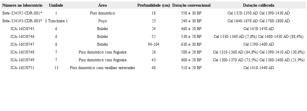 Foram realizadas seis datações radiocarbônicas em carvões coletados durante as escavações das diferentes feições ( Quadro 1). As datações dos carvões corroboram as datações obtidas anteriormente por Schaan (2016), à exceção da trincheira onde não foram datados os depósitos arqueológicos. Assim, essas datações confirmam a ideia de uma expansão tapajônica tardia com assentamentos permanentes na área do platô de Belterra ( Stenborg, 2016). Os séculos XIV e XV são considerados, pela literatura, como a época de apogeu da cultura tapajônica na região do baixo Amazonas ( Quinn, 2004; Roosevelt, 1999).