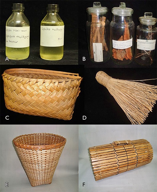Os objetos confeccionados a partir de espécies fibrosas também estão representados neste acervo, como paneiros, peneiras, abanos, vassouras, cofos, entre outros, e foram incorporados no âmbito de pesquisas etnobotânicas, como a de Santos e Coelho-Ferreira (2011). Entre as matérias-primas que constituem esses objetos estão a raiz do cipó-titica (Heteropsis flexuosa (Kunth) G.S. Bunting), empregada nas amarrações de paneiros e na composição de vassouras; o buriti (Mauritia flexuosa L. f.), do qual se retiram as fibras das folhas para compor um tipo de paneiro; a folha do babaçu, na fabricação de cestos, chamados de cofos, empregados para alocar caranguejos; o arumã ou guarumã (Ischnosiphon arouma (Aubl.) Koem.), ou, mais especificamente, suas fibras, a partir das quais são produzidos objetos úteis tanto em atividades domésticas, a exemplo de peneiras, abanos e paneiros, quanto em atividades econômicas, como a pesca, a exemplo do paneiro-de-filho, objeto que propicia a captura de peixes ocorrentes em manguezais. Algumas amostras estão ilustradas na Figura 2.