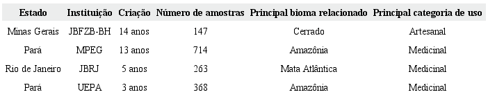Foram identificadas quatro coleções etnobotânicas, localizadas em três estados (Minas Gerais, Pará e Rio de Janeiro), as quais refletem aspectos socioculturais e econômicos associados ao uso de plantas dos biomas Amazônia, Cerrado e Mata Atlântica (Quadro 1). São acervos inicias e ainda em número reduzido, quando comparados com a maioria das coleções dos demais países.