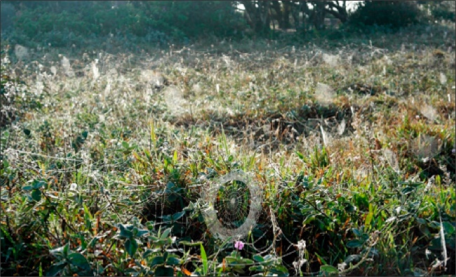 Na chegada em campo, sempre armo a barraca no local costumeiro dentro do terreno de Juarez e Lindalva. Contudo, dois dias antecedendo as tempestades, já estava desconfiado de que a minha presença e a da barraca estavam sendo partilhadas com a moradia de outros seres. Aranhas e insetos sempre se escondiam no sobreteto da barraca, quando os ventos fortes das tempestades começavam. Desconfio que as aranhas eram atraídas pelos insetos, já que eram evidentes algumas teias com indivíduos mortos. Porém, em uma manhã com muita ‘fumaça’ [nevoeiro], devido à umidade, percebi que a barraca e eu estávamos emaranhados em uma paisagem complexa de teias de aranhas. O orvalho se prendeu nas teias, deixando-as evidentes aos meus olhos destreinados, demonstrando que eu tinha invadido territórios aracnídeos. Uma teia cruzava com a outra e muitas estavam presas em minha barraca, formando uma enorme malha no meio da restinga9.