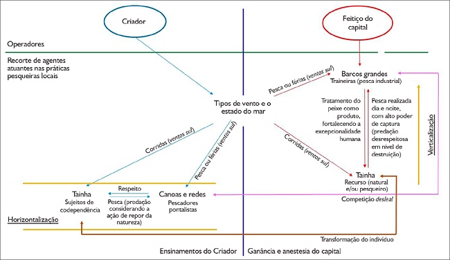 A Figura 2 mostra alguns dos agentes atuantes nas práticas pesqueiras pontalistas e uma breve sistematização da transformação da perspectiva simétrica entre tainhas (enquanto sujeito de codependência) e canoas pontalistas, para a assimetria entre tainhas (enquanto recursos) e traineiras. Ou seja, apesar de os tipos de ventos e o estado do mar estarem a todo instante se relacionando com as tainhas, traineiras e canoas pontalistas, enquanto que nas práticas pesqueiras aproximadas aos ensinamentos do Criador nota-se a horizontalização, na anestesia aplicada pelo capital observa-se a verticalização. Estou ciente de que o ato de diagramar possa impossibilitar expor todos os agentes atuantes nas práticas pesqueiras, que envolvem as competições entre barcos grandes e canoas pontalistas – além de, é claro, poder transparecer certo ar estabilizante para as relações, o que não é a minha pretensão –; contudo, considero que diagramas e gráficos têm o seu poder didático de possibilitar a abertura de entendimentos de leitores de outras áreas para além da antropologia, propiciando a abertura para novas visões e críticas.