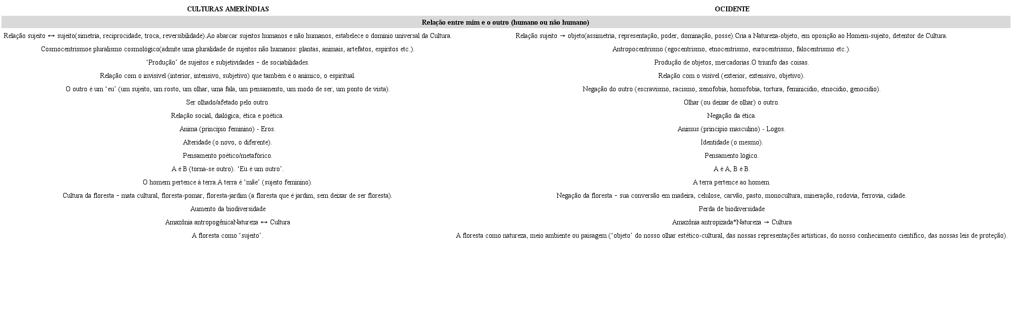 O que houve na Amazônia, durante toda a sua longa história pré-colonial, não foi a clássica antropização dos espaços naturais, a Cultura suplantando a Natureza de modo violento e irreversível, com base na pura e simples ‘negação da floresta’ (Quadro 1). O que houve foi o aparecimento, a invenção de uma autêntica ‘cultura da floresta’2, isto é, a transformação cultural da floresta, o seu ‘cultivo’, sem que ela deixasse de ser floresta. Isso aconteceu porque, nas sociedades indígenas da planície amazônica, prevalece, não a relação sujeito-objeto, antropocêntrica, de poder e dominação3, mas a relação entre sujeitos, humanos e não humanos, baseada na troca e na reciprocidade.