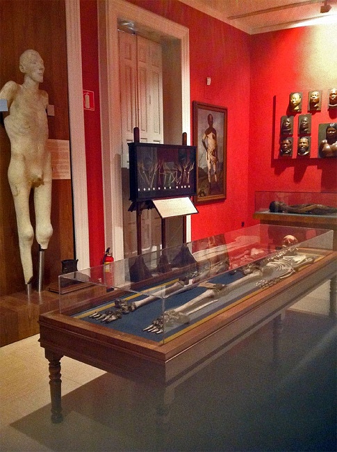 Percorrendo esse ambiente cenográfico de um suposto gabinete de curiosidades do século XIX, os participantes do curso visitaram a coleção integrada por el gigante. Conheceram, em primeiro lugar, Agustín, sobre o qual todos já ouviram histórias. Junto à sua ossada, os visitantes também puderam conhecer a estátua de seu corpo, produzida ainda em finais do século XIX pelo Dr. Velasco; uma múmia guanche13, exibida em uma espécie de cama de vidro justo ao lado de Agustín; as dezenas de crânios humanos, alvo de polêmicas trocas científicas entre o fundador do museu e seu colega francês, Paul Broca14; além de esqueletos de símios e outras peças representativas dos reinos vegetal e mineral.