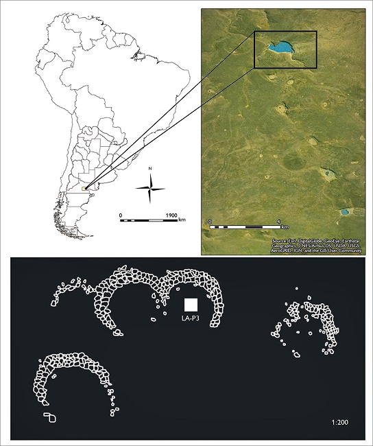 El Parapeto 3 de Laguna Azul (LA-P3) forma parte de una serie de tres estructuras interconectadas con una morfología semicircular, construido a partir de una pirca seca, sin materia cementante, con una abertura hacia el Este y cuyas dimensiones no superan los ca. 3 m de cuerda y 2 m de profundidad (Figura 1). Hacia el centro de esta estructura se planteó una cuadrícula de 1 m x 1 m, de donde se identificó una secuencia estratigráfica homogénea con una potencia sedimentaria total de 50 cm de profundidad.