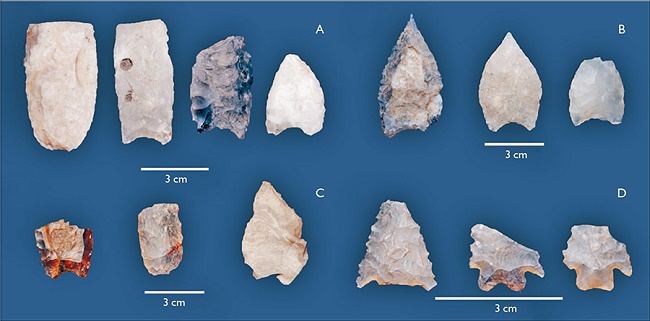 Por otro lado, el estudio del diseño y de la morfología de las piezas permitió reconocer dos grandes grupos de acuerdo al área de enmangue (pedunculadas y apedunculadas) y a la forma perimetral del limbo (lanceolada y triangular) que coexisten en la estratigrafía de LA-P3.