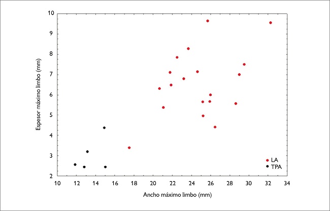 A diferencia de este grupo, las TPA registraron anchos de bases con dimensiones menores de 13,56 mm promedio y una terminación principalmente cóncava atenuada a recta (Tabla 3).