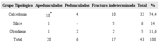 Este grupo está caracterizado por un total de 19 piezas que registraron en su mayoría algún tipo de fractura (84%, n = 16). La calcedonia es la roca predominante para su manufactura al igual que en la totalidad del conjunto (Tabla 1).