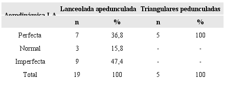 Respecto a la aerodinámica es fundamental para determinar si un sistema es arrojadizo y se define a partir de la interrelación entre los atributos de la sección transversal, porción de los bordes del limbo, largo y ancho de las puntas. Cuanto mayor es la superficie de contacto de la punta con el aire, mayor será la aerodinámica (Hughes, 1998). En el registro de LA-P3, las piezas identificadas como de morfología lanceoladas apedunculadas presentaron una gran superficie de contacto con el fluido y, por lo tanto, registran en su mayoría una aerodinámica imperfecta (47,4%). Mientras que en el caso de las triangulares pedunculadas, se observó una superficie pequeña y aerodinámica perfecta para este tipo de diseño (Tabla 2).