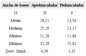 En cuanto a las características dimensionales, estas piezas son significativamente menores (longitud M-W = U = 1, p < 0,05; ancho: M-W = U = 0, p < 0,05; espesor: M-W = U =1, p < 0,05; peso: M-W = U= 0,50, p < 0,05) que el grupo de apedunculadas, y muestran dimensiones cuyas medianas son: 15,19 mm de longitud, 13,17 mm de ancho y 2,55 mm de espesor; mientras que el peso fue igualmente menor de 0,7 grs (Figura 3).