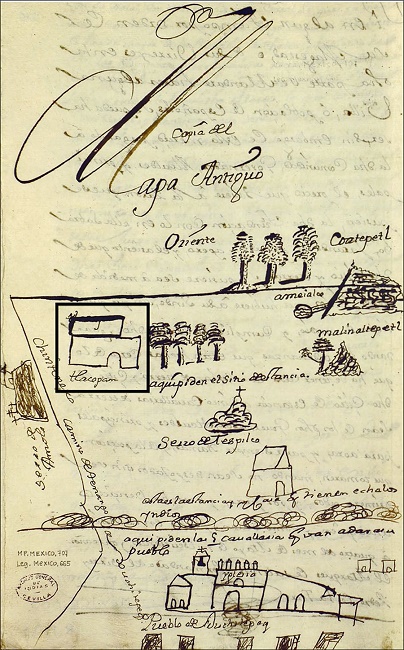 Serrano Espinosa y Pérez-Rocha (1998, pp. 47-48) sugieren que la explanada correspondería a la plaza citada por Cortés y que Bernal Díaz del Castillo (ca. 1495-1524) menciona como “los patios de Tacuba”. Probablemente es eso lo que se representa en la copia de un mapa antiguo, compilado en un expediente de delimitación de tierras de la primera mitad del siglo XVIII (Figura 2)5. En ese documento, el pueblo de Tacuba se señala aún con el nombre prehispánico de Tlacopan, simbolizado en el diseño de una estructura de doble talud, con una puerta en forma de arco en la parte inferior6. Ese ícono es el mismo que corona el Cerro de Amola, junto a unas cruces, por lo que ambos aludirían al mismo tipo arquitectónico o a un espacio con la misma función. Sus características son muy distintas de las que se emplearon para dibujar la iglesia de Juchitepeq [Xuchitepec], con un campanario, la fachada y una pared porticada.