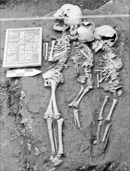 El individuo denominado 30C es un niño de seis años que fue enterrado junto a dos infantes, de cuatro y ocho años. Su cuerpo se encontraba depositado en decubitus lateral (derecho), con el esqueleto orientado de oeste a este. El cráneo, alineado de norte-sur, miraba hacia el sur, mientras que sus miembros estaban extendidos, con excepción del brazo izquierdo que tenía flexionado. Manzanilla López (1985, p. 62) señala que esta práctica corresponde a una variante del ritual cristiano que predominó a lo largo del siglo XVI en México, normalmente en decubitus dorsal. Lo mismo se verificó en las excavaciones de Tepito y en Chapingo (Estado de México), donde se documentaron entierros “mexicas” en decubitus lateral y que “parecen indicar que en el Siglo XVI, algunos indígenas del Altiplano no habían asimilado aún las costumbres funerarias cristianas ó [sic.] bién [sic.], que estas se adoptaron parcialmente” (Manzanilla López, 1985, p. 62).