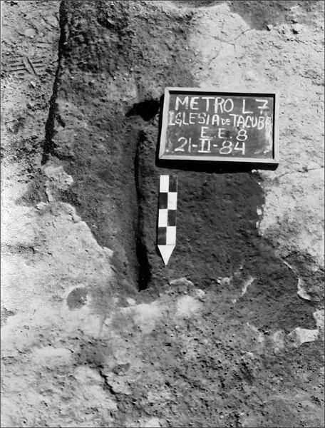 La capa XI estaba perfectamente sellada con lo cual las inhumaciones de la fosa n. 30 y n. 33 ocurrieron entre la construcción de los pisos n. 1 y n. 2, que delimitaban este nivel arqueológico por arriba, marcando el terminus ante quem, y el abandono del piso n. 3, que apareció inmediatamente debajo y señala el terminus post quem. El arqueólogo determinó que el nivel IX corresponde a un relleno que preparó el terreno para la construcción de los pisos n. 1 y n. 2. Esos pavimentos presentaban una superficie rugosa de color rosado, eventualmente de cal y arena. El primero tenía una pendiente este-oeste y el segundo norte-sur, de tal modo que eran convergentes, posiblemente para nivelar el suelo sobre el que se construyó la iglesia de Tacuba, a mediados del siglo XVI (Manzanilla López, 1985, p. 49). Aunque ambos pisos tenían características prehispánicas, la presencia de materiales de cerámica vidriada de manufactura indígena con influencia europea en las capas arqueológicas inferiores (capas XII y XIII) los ubica claramente en época virreinal (Manzanilla López, 1985, p. 50).