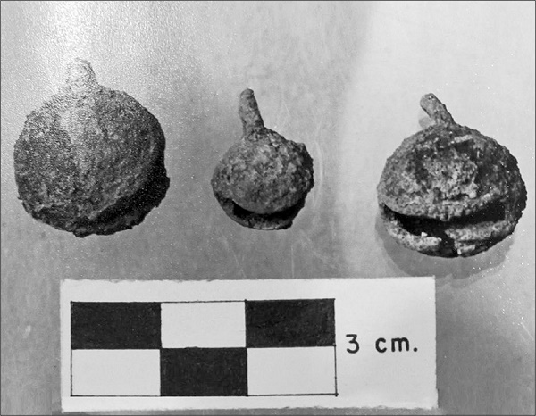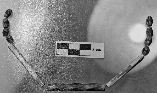 De los individuos excavados en las fosas n. 30 y n. 33, la particularidad del 30C es que se decoró su cuerpo con complementos. Estos consistían en tres cascabeles de cobre que se recuperaron en la parte inferior de las tibias y que pudieron conformar el adornos de unas tobilleras con sonajero: una sobre el tobillo derecho y dos sobre el izquierdo (Figura 8). Según Manzanilla López (1985, p. 59) este modelo aparece en el Altiplano desde el año 950 d.C. hasta 1550, en excavaciones como Calixtlahuaca, Teotihuacán y Tenochtitlán (Manzanilla López, 1985, p. 58). Las complementaba una alhaja de cuentas de vidrio, seguramente un collar o pectoral. De ese ejemplar se recuperaron once cuentas de vidrio depositadas originalmente sobre las cervicales, después ensartadas para registrarlas fotográficamente (Figura 9). Se entiende que la disposición de los abalorios en la fotografía del informe corresponderá a su configuración original in situ pero no existen más datos acerca de ello y en la fotografía de la fosa n. 30 (véase Figura 4) no se distinguen los adornos del individuo C. Todos los materiales fueron inventariados con el número de Catalogo de Salvamento Arqueológico (CATSA) 18918 11/11, sin marcación individual pero, para poder destacar las particularidades de algunas piezas, se optó por atribuir un número distinto a cada una de las cuentas. Actualmente la colección está custodiada por el Depósito de la División de Salvamento Arqueológico del INAH, la antigua Alhóndiga de México12.