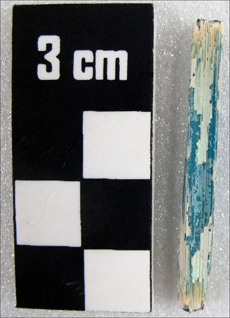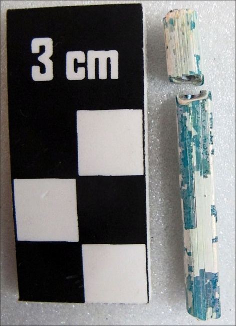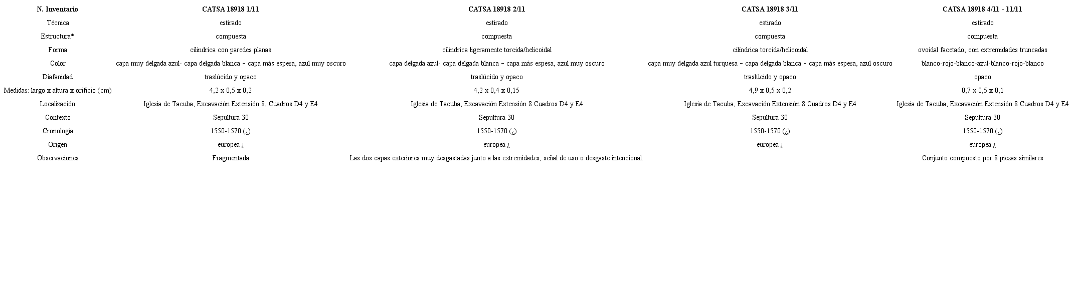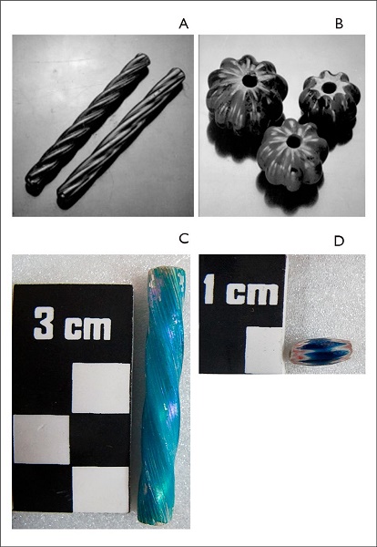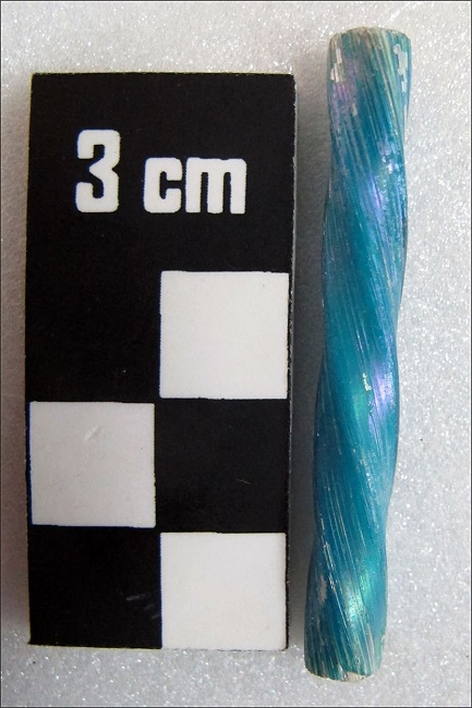 Los ejemplares del primer tipo señalado varían entre la forma cilíndrica de sección cuadrada y lados perfectamente planos (Nueva Cadiz Plain), (Figura 10: n. inv. CATSA 18918 1/11), y la forma cilíndrica de sección cuadrada ligeramente retorcida (Figura 11: n. inv. CATSA 18918 2/11), hasta el modelo cilíndrico de sección cuadrada y helicoidal (Nueva Cadiz Twisted), (Figura 12: n. inv. CATSA 18918 3/11). Las tres cuentas presentan un orificio transversal circular y están compuestas por tres capas sucesivas de vidrio de color azul, blanco y azul, siendo la del interior la más espesa y oscura. Se tratan de ejemplares bastante ligeros que emiten un sonido metálico al chocar, aspecto que los diferencia de las piezas del mismo modelo encontradas en territorio portugués (Lisboa) (Martins Torres, 2007). Los primeros fueron elaborados con una fórmula de vidrio sódico-cálcica con abundancia de sílice, característica común a varios ejemplares recuperados en contextos arqueológicos novohispanos (Salas Contreras & López Ignacio, 2011).