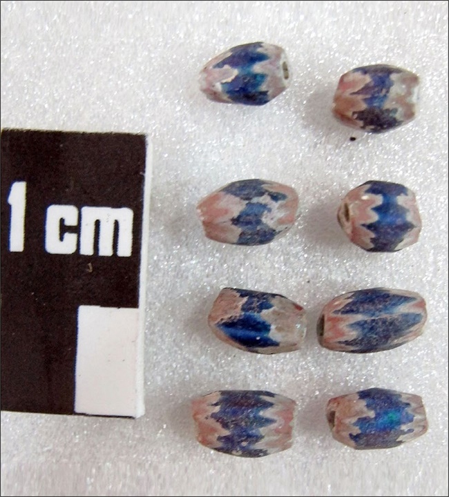 El segundo tipo, designado de ‘chevron’, estrella o padrenuestro, presenta una forma ovoide de sección prismática, con orificio transversal circular (Figura 13: n. inv. CATSA 18918 4/11 a 11/11). Al igual que el modelo anterior, las ocho cuentas están compuestas por sucesivas capas de vidrio de color distinto, formando siete niveles en tonos de azul, blanco y rojo. Los extremos presentan un desgaste intencional que le confiere una forma achaflanada y hace visible los diferentes colores en forma de estrella. El número de puntas es irregular, así como el facetado, predominantemente en número de doce. Algunas de las piezas tienen una forma también bastante irregular, con sección triangular o cuadrangular, que pone de manifiesto el poco cuidado del artífice en la ejecución de la pieza y, sobre todo, en el acabado. Eso se podría relacionar con una producción hecha por profesionales poco especializados que fueron incapaces de ejecutar piezas de pequeñas dimensiones con la precisión habitual, o eventualmente con una manufactura de bajo coste que iba direccionada a un público menos exigente o de bajos recursos económicos.