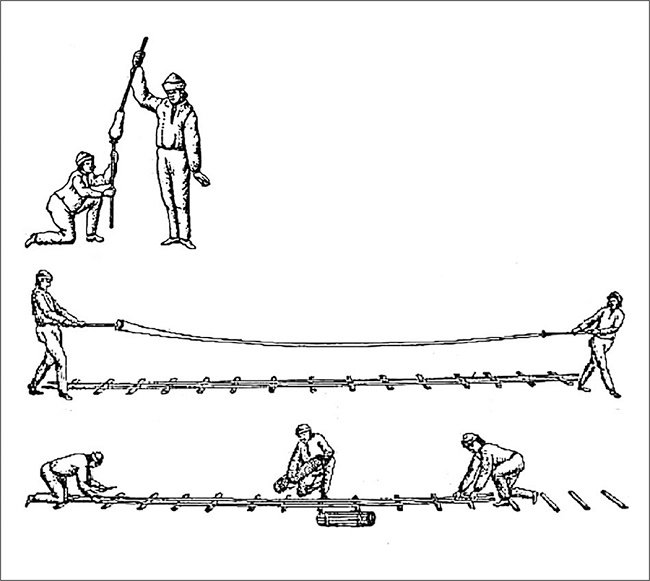 Las cuentas ‘Nueva Cádiz’ y ‘chevron’ se produjeron mediante la técnica de vidrio estirado (drawn bead). Para hacer el tubo, el artesano necesitaba dos barras de hierro, colocadas una en cada extremo de la masa de vidrio caliente (Figura 14). A esta masa disforme se le confería inicialmente una forma de embudo para crear una burbuja de aire que constituiría después el orificio de la cuenta. Después se estiraba progresivamente hasta alcanzar una forma tubular alargada, igualando progresivamente el diámetro de las extremidades del tubo. Por fin, se retiraban los elementos de hierro y se obtenía un largo tubo de vidrio que podría alcanzar hasta 90 cm de largo, medida a partir de la cual se volvería quebradizo. Posteriormente se cortaba la barra de vidrio en tubos menores, llamados ‘diamantes’. Estos se cortaban, con una especie de guillotina, en pequeñas unidades que se designaban ‘margaritazas’ y llevaban al fuego, dentro de un cilindro de hierro con carbón y arcilla, para perder las rugosidades.