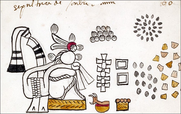 La configuración del enterramiento 30C con estos dos tipos de adorno (sonajeros y cuentas) encuentra similitudes con algunas pinturas indígenas que registran rituales funerarios, particularmente en los manuscritos que componen el designado Grupo Tudela13. Nos referimos a los bultos funerarios con collares de cuentas verdes y cascabeles (Figuras 16 y 17), con sartas de cuentas y de cascabeles (Figuras 18 y 19) o piedras talladas de diferentes colores (Figuras 20 y 21) que contribuyen a la tesis de que este individuo mantenía un estrecho vínculo con las tradiciones prehispánicas y las comunidades autóctonas. Más allá de los motivos que explican su muerte, el encuadramiento cronológico nos hace avanzar con la teoría de que las cuentas son de producción italiana, puesto que en este período no se conocen otros centros manufactureros de esos modelos en Europa. Cabe aún la posibilidad de que se hicieran ya en la Nueva España donde Diego Balderas producía cuentas de vidrio al menos desde 156114 y el vidriero Blas Hernández conocía el arte de hacer abalorios desde antes de 1595, cuando se propone enseñarlo al italiano Ángelo Carlo15.