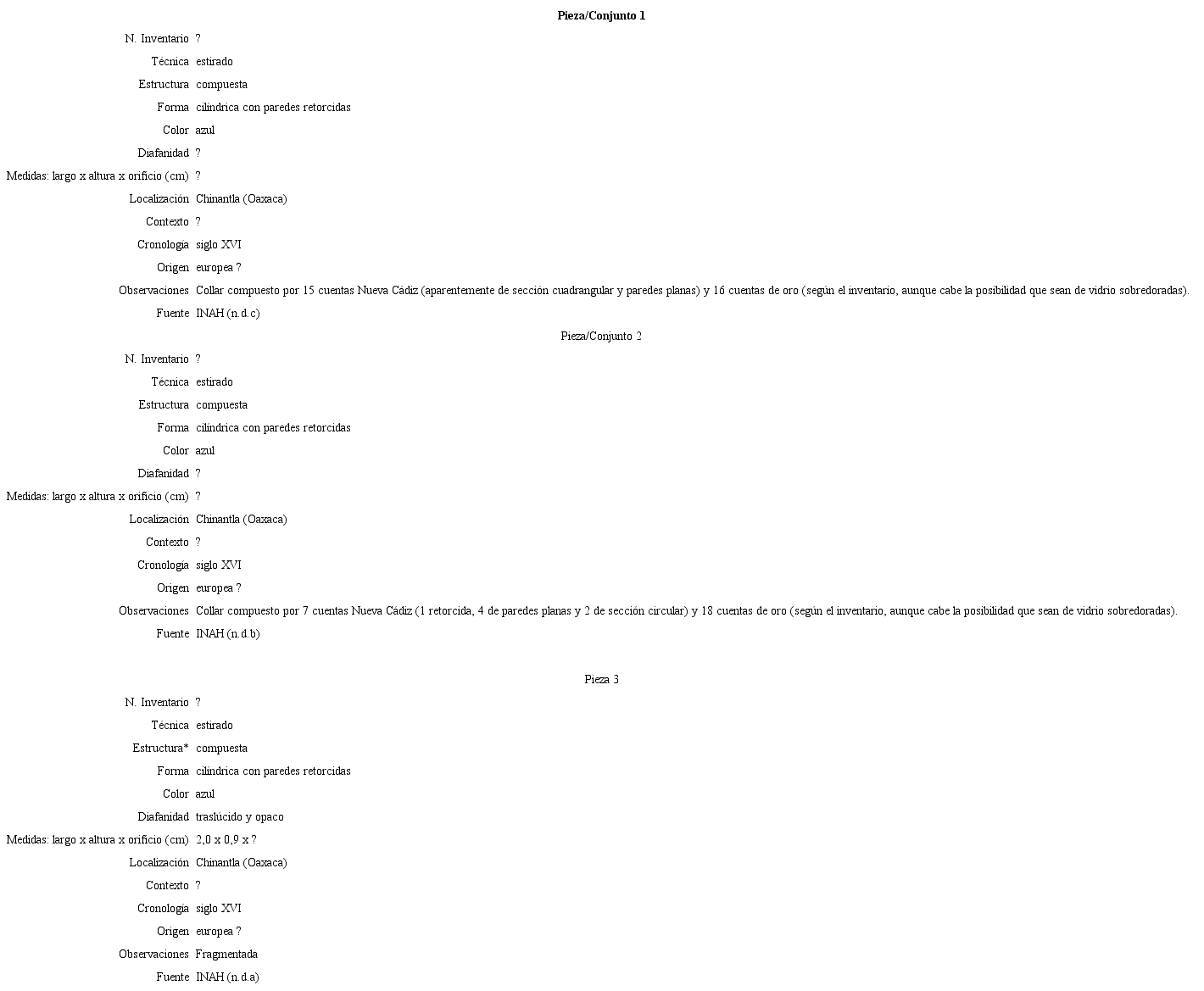 En lo que respecta particularmente a México, no se ha localizado ningún trabajo sobre estos tipos de cuenta aunque en la mediateca del INAH se registraron tres sartas (dos compuestas y una sencilla) con cuentas de estilo ‘Nueva Cádiz’ procedentes de una excavación en Chinantla (Oaxaca), en contextos clasificados del siglo XVI. Aparentemente ninguno de los ejemplares se conjugaba con cuentas ‘chevron’ en las dos sartas compuestas, como sucede en otras regiones americanas, sino que se asociaron con pequeñas cuentas globulares de metal dorado que atendían a los preceptos de la estética prehispánica vigente hasta entonces (Tabla 2).
