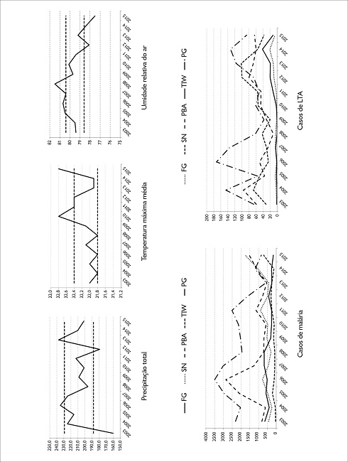 É amplamente conhecida a correlação direta entre proliferação de insetos vetores e os índices pluviométricos, de temperatura e de umidade, especialmente em casos de doenças como malária e leishmanioses (Chaves; Pascual, 2006; Olson, 2009). Mudanças no microclima regional podem ser desencadeadas tanto por impactos restritos quanto por uma conexão em rede com o clima do planeta, em que pautas como o aquecimento global e eventos sazonais como El Niño e La Ninã afetam a incidência de doenças (Hunter, 2003). No intuito de compreender os efeitos da variação climática e de entender se a ocorrência de eventos climáticos abruptos ou intensos pode explicar o aumento repentino de doenças na região, foram construídas curvas históricas de precipitação total, temperatura máxima média e umidade relativa do ar, referente aos anos de 2003 a 2015. Para tal análise, foram utilizados dados mensais disponíveis na internet do Instituto Nacional de Meteorologia (INMET). Uma curva mediana foi construída para cada variável, sendo vista como referência, de forma que foram considerados atípicos anos que apresentaram valores superiores ou inferiores ao desvio padrão da mediana.
