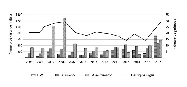 Dados do Ministério da Saúde, do Sistema de Informação de Agravos de Notificação (SINAN) e do Sistema Nacional de Notificação de Malária (SIVEP-Malária) foram utilizados para a construção de séries históricas de casos das doenças no período de estudo (Conselho Nacional de Saúde – CONEP; Certificado de Apresentação para Apreciação Ética - CAAE: 20188213.9.0000.5091). O SIVEP-Malária foi também utilizado para a construção de uma série histórica referente ao número de garimpos registrados. Assim, casos de malária foram analisados segundo grupos especiais: área indígena, assentamentos e garimpos.