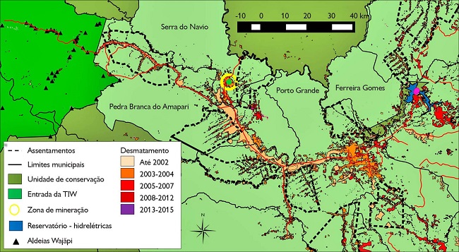 Resumo: A realização de estudos de impacto ambiental (EIA) prévios à implantação de grandes empreendimentos é obrigatória no Brasil. Porém, os critérios normativos para delimitação de áreas de influência são considerados imprecisos e insuficientes. O presente artigo busca demonstrar como impactos ambientais em série causados pela implantação de usinas hidrelétricas e por projetos de mineração industrial no Amapá desencadearam surtos de malária e de leishmaniose tegumentar americana (LTA) na Terra Indígena Wajãpi e em outros assentamentos da região central do estado. Análises espaciais de desmatamento, curvas de variações climáticas e cronologia de impactos de tais empreendimentos, feitas entre 2003 e 2015, foram utilizadas para verificar a correlação de efeitos na saúde em comunidades não incluídas durante as diversas fases do licenciamento para implantação destes empreendimentos. Os resultados demonstram que surtos de malária e de LTA estiveram correlacionados com aumento das taxas de desmatamento causado pela expansão de assentamentos rurais, mas principalmente pela implantação de duas usinas hidrelétricas e intensificação de atividades de mineração industrial de ouro e de ferro, assim como o consequente incremento de garimpos na região. Os resultados explicitam a fragilidade do processo de licenciamento ambiental para delimitação de áreas de influência indireta, principalmente relacionados a aspectos da saúde.