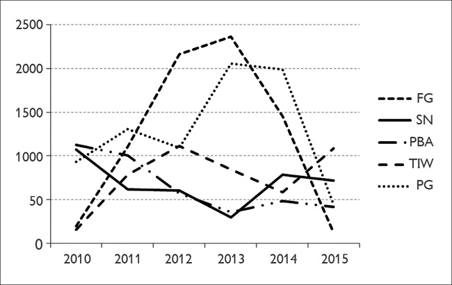 A Figura 4 demonstra como o número de exames realizados por busca ativa de casos variou em mais de 1.000% em um período de cinco anos em Ferreira Gomes e em Porto Grande, com incremento abrupto em 2010 e pico em 2013, além de queda também repentina em 2015. Esta variação não foi demonstrada nos demais municípios e na TIW. Tal achado é semelhante ao padrão observado na usina de Belo Monte, no Pará, em que as ações de controle implementadas pela empresa, com apoio do Ministério da Saúde, foram capazes de reduzir a incidência de malária na área de influência direta da usina (CTMC, [2014-2015]).