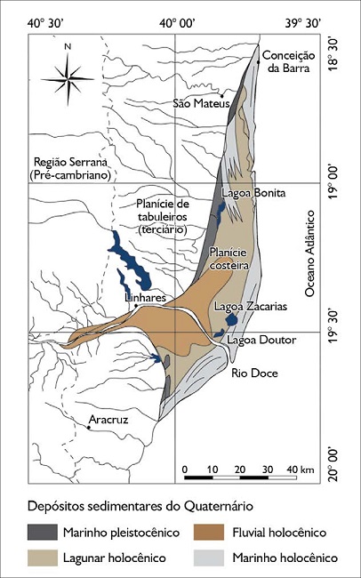 COHEN, Marcelo Cancela Lisboa; FRANÇA, Marlon Carlos; ROSSETTI, Dilce de Fátima; PESSENDA, Luiz Carlos Ruiz; GIANNINI, Paulo César Fonseca; LORENTE, Flávio Lima; BUSO JR., Antônio Álvaro; CASTRO, Darcilea; MACARIO, Kita. Landscape evolution during the late Quaternary at the Doce River mouth, Espírito Santo State, Southeastern Brazil. Palaeogeography, Palaeoclimatology, Palaeoecology, Amsterdam, v. 415, p. 48-58, Dec. 2014. DOI: https://doi.org/10.1016/j.palaeo.2013.12.001.