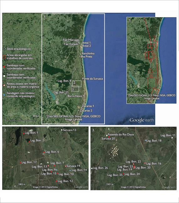Após o completo assoreamento das lagunas, o rio Doce passaria a desembocar no oceano, como acontece atualmente (Suguio et al., 1982; Martin; Suguio, 1992). As atuais lagunas de Zacarias, Doutor, Bonita etc., ao redor das quais existem numerosos sambaquis, representam remanescentes do sistema lagunar holocênico (Figura 1).