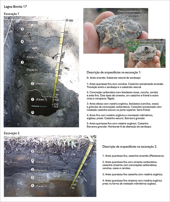Em ambos os sítios estudados, ficou evidente a diferença estratigráfica e composicional das duas áreas de escavação abertas (Figuras 4 e 6). No sítio Lagoa Bonita 17, isto é especialmente visível no que se refere à alteração pós-deposicional do sambaqui. A escavação 1, aberta na parte mais alta do montículo (Figura 3), apresentou uma concreção carbonática decimétrica a cerca de 50 cm de profundidade, e que se estende até o contato do sambaqui com o depósito natural subjacente (~90 cm). A concreção, de altíssima dureza, teve de ser escavada com um equipamento especial (do tipo vibro corer) capaz de quebrar o material cimentado. Foram observados diversos fragmentos de osso, carvões e algumas conchas inteiras (inclusive, um desses carvões foi retirado para datação) imersos no cimento carbonático (fácies 6, Figura 4). A presença da concreção levantou a dúvida quanto aos processos tafonômicos que afetam alguns sambaquis da região.