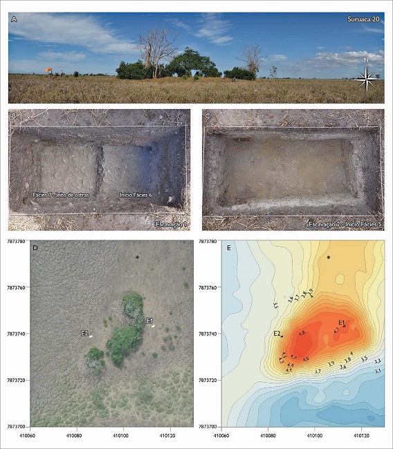 Assim, a estratégia de escavação adotada revelou situações bem diferentes para porções distintas de cada sambaqui analisado. Estas diferenças são especialmente mais marcantes no sítio Suruaca 20, onde, inclusive, o substrato de cada área de escavação não seria o mesmo, o que indica distintos processos de formação em áreas próximas do mesmo sítio. Estas diferenças se fazem evidentes também nas idades 14C obtidas para as diversas áreas de escavação, como descrito no tópico a seguir.