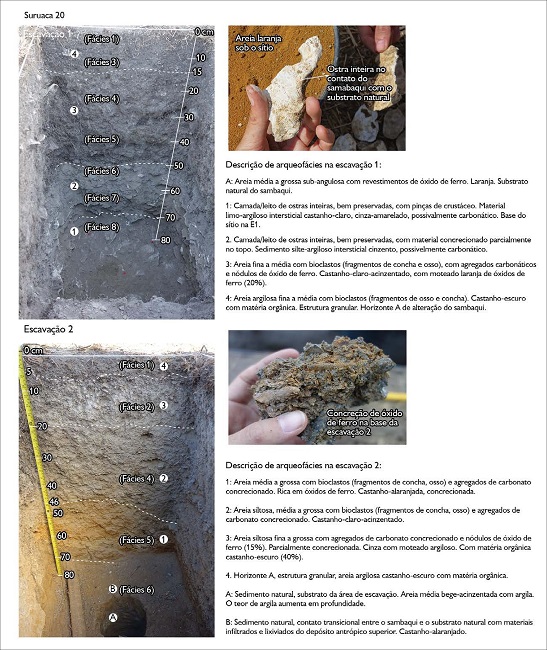 As duas escavações abertas no sítio Suruaca 20 revelaram diferenças composicionais bem definidas (Figura 5). A escavação 1, aberta na parte mais alta do sambaqui, revelou alguns bolsões com concentração de ostras nos primeiros 50 cm, onde o sedimento é mais friável, com nódulos de óxido de ferro e fragmentos de concha, ossos, carvões e pinças de crustáceo. Após uma camada concrecionada de cerca de 10 cm de espessura (fácies 6, Figura 5), aparece uma camada de ostras inteiras, imbricadas e bem preservadas, mas sem cimentação carbonática. A partir dos 80 cm de profundidade, a frequência de ostras diminui, aumentando a quantidade de pinças de crustáceo (cerca de 20% de ostras e 80% de sedimento, pinças e ossos de peixe). A camada de ostras inteiras e de pinças de crustáceo se estende até o contato abrupto do sítio com o substrato natural (a cerca de 95 cm), o que sugere a existência de um possível ‘leito de ostras’ na base do sambaqui. Os sedimentos naturais debaixo do sítio são areias médias amarelo-alaranjadas, semelhantes às descritas para o sítio Lagoa Bonita 17.
