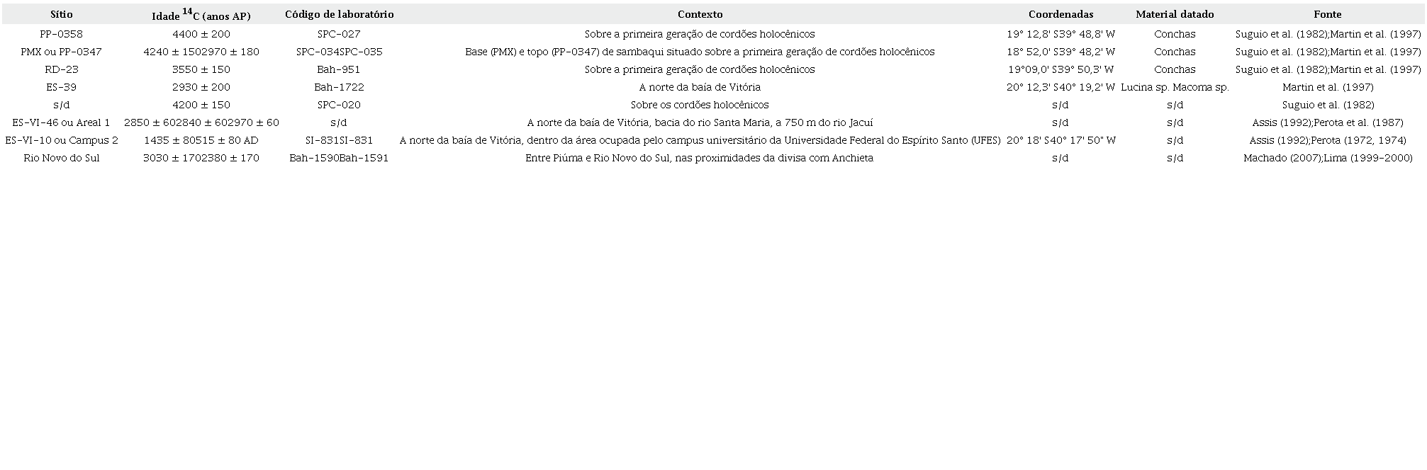 A primeira cronologia baseada em idades absolutas nos sambaquis do Espírito Santo apareceu no trabalho de Suguio et al. (1982) sobre a evolução da planície costeira do rio Doce durante o Quaternário. Este era o único trabalho, até hoje, a fornecer idades absolutas publicadas para quatro sambaquis do Espírito Santo e serviu de base para estabelecer cronologias relativas de sítios arqueológicos em todas as pesquisas posteriores. Fora da área de estudo, existem mais quatro datações absolutas para sambaquis do Espírito Santo (Quadro 1). Segundo o modelo evolutivo de Suguio et al. (1982), durante a transgressão marinha holocênica – que teria alcançado o seu máximo na região entre 6500 e 5500 anos AP – o rio Doce desembocava em um estuário. Durante este período, a formação de ilhas-barreira provocou o isolamento de um sistema lagunar a retaguarda.