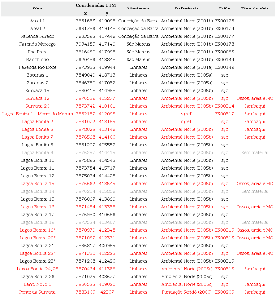 Foram visitados 16 sítios descritos nos relatórios da empresa Ambiental Norte para o município de Linhares, cujas coordenadas foram cadastradas originalmente usando-se o referencial South American Datum 1969 (SAD 69). Quando os sítios foram detectados, realizou-se o seu registro por meio do Sistema de Referência Geocêntrico para as Américas (SIRGAS) 2000. No Quadro 2, estão agrupados os 36 sítios descritos no litoral norte, com identificação daqueles cujas coordenadas e composição foram verificadas nesta pesquisa.