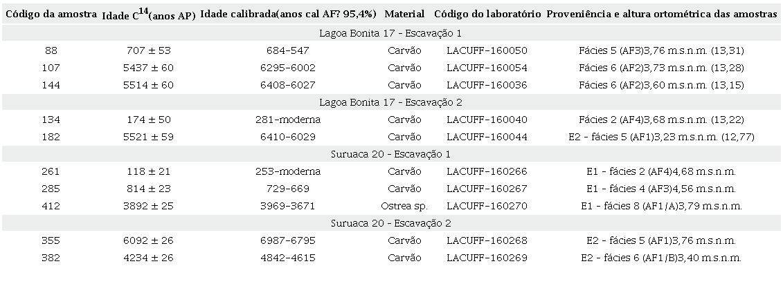 Uma inversão nas idades 14C foi detectada na escavação 2 do Suruaca 20, onde a amostra de cerca de 6800 anos cal AP (amostra 355) encontra-se 36 cm acima da amostra de 4650 anos cal AP (amostra 382) (Quadro 3). Esta inversão pode ser explicada pelo fato de a amostra 382 se tratar de um carvão pequeno, recuperado da fácies de transição entre o sambaqui e o depósito natural. Este depósito contém mistura de sedimentos arqueológicos e naturais com bioturbações e frentes de alteração, ou seja, a amostra de carvão seria claramente intrusiva. A amostra 355, pelo contrário, encontra-se na camada basal do sambaqui que está bem preservada.