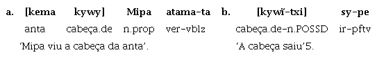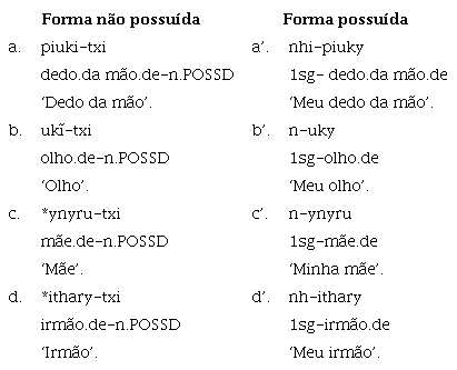 No exemplo (1a), nenhuma marca morfológica é adicionada ao nome possuído kywy, no qual há apenas dois nomes justapostos, kema kywy. Em se tratando de nomes inalienáveis, como kywy, em contextos muito excepcionais, ocorrem como não possuídos, a exemplo de (1b), e requerem a presença do sufixo -txi, o qual funciona como um elemento que, quando ocorre, ‘suspende’ o status de ‘obrigatoriamente possuído’ de certos nomes inalienáveis. O sufixo de não posse -txi, entretanto, aplica-se apenas a certos subgrupos semânticos de nomes dessa categoria, quais sejam: partes do corpo ou significados associados ao corpo, pertences individuais, conceitos abstratos, outros conceitos (por analogia) (Facundes, 2000). Termos de parentesco não ocorrem com o sufixo -txi.