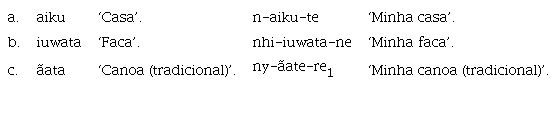 Os ‘nomes alienáveis’, segundo Facundes (2000), são aqueles que precisam dos sufixos -te, -ne e -re1 quando possuídos; são notoriamente marcados em construções possessivas e não marcados em construções não possessivas. A escolha entre -te, -ne e -re1 é lexicalmente determinada. Os exemplos (3a), (3b) e (3c) ilustram a ocorrência desses sufixos: