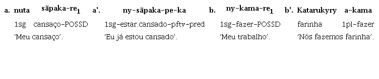 Por fim, os ‘nomes mistos’, conforme Facundes (2000), são marcados tanto na forma possuída quanto na forma não possuída. Quando possuídos, admitem a marca de posse -re2 e, quando não possuídos, recebem a marca -ry, conforme os exemplos (4a) e (4b):