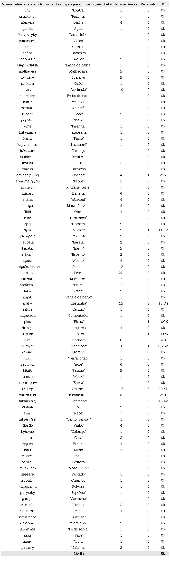 Com base nos nomes inalienáveis encontrados nos 31 textos analisados, verifica-se frequência média de 87,94% de suas ocorrências na forma possuída, sendo que todos os nomes listados na Tabela 1 ocorrem como mais frequentemente possuídos do que como não possuídos, com exceção do nome tywy ‘coisa’, o qual, em todos os contextos encontrados no corpus, ocorreu na forma não possuída; tal nome, embora morfologicamente marcado como inalienável na língua Apurinã, não parece se inscrever semanticamente em uma categoria prototipicamente esperada para inalienáveis, o que, talvez, justifique sua diferença com relação aos demais inalienáveis do corpus.