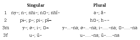 (i) nomes de animais e de substâncias/fenômenos/paisagens da natureza ocorrerem apenas com os sufixos -te e -ne, característica semântica que diferencia esses dois sufixos dos demais (que não ocorrem com esses dois grupos semânticos de nomes); isso se deve ao fato de apenas os sufixos -te e -ne ocorrerem com nomes cuja posse é considerada pelos falantes como pouco familiar/comum (a posse de nomes como ãkiti‘onça’, kema ‘anta’, kasyry ‘lua’ e atukatxi ‘sol’, de fato, parece ser, no mínimo, bastante incomum, ocorrendo em contextos hipotéticos muito particulares). De todo modo, há algumas diferenças entre -te e -ne: o sufixo -te se aplica a um número maior de grupos semânticos e é mais frequente do que -ne; em todos os casos atestados em que os falantes desconheciam um dado nome, seja nos casos de variação dialetal ou nos de referentes desconhecidos, foi usado o sufixo -ne;