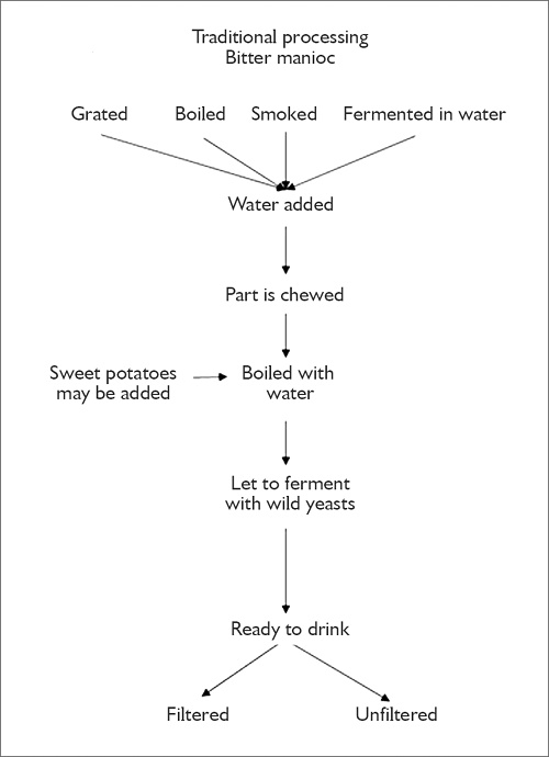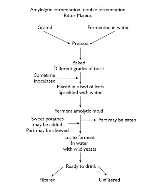 Most of the documents are not detailed enough to accurately reconstruct the production sequences. The processes probably followed variations between different ethnic groups. It is possible to reconstruct in principle the sequences of traditional wild yeast fermentation and of the two large families of amylolytic processes: direct amylolytic fermentation and double fermentation with amylolytic fermentation added by fermentation with wild yeasts in water. The first sequence reflects the processes of the Montaña region, to which Souza (1875) and Martius (1868 [1820]) may be added, the second reflect the Guianese tradition (Figure 1 to 3).