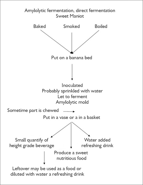 Souza’s (1875) description of the process is detailed, and the fermentation process is clearly limited to amylolytic molds. The process followed the traditional preparation of loaves of cassava bread, moistened and covered with manioc leaves, and then protected with banana leaves. After three or four days, they recovered the cassava loaves and placeed them in large pots hermetically sealed with banana leaves. After two days, the fermentation produced a half quartilho (0.35 l) of a transparent liquid with the taste of white wine for each pot; it was a real alcoholic beverage. Later, the product, diluted with water, could be drunk immediately as a refreshing drink, or left to ferment, where it produced an intoxicating beverage. We are faced with a product of pure amylolytic fermentation, which may later be fermented with wild yeast.