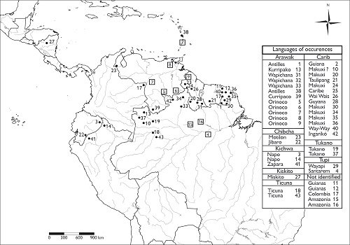 Within the records, it is possible to recognize two separate traditions, the first in the region of the Montaña (Steward, 1948-1959): the Rio Napo, and the Pastaza, and a second in the Guianas, with an extension into the upper Rio Negro and to the Caribbean islands. The other records are isolated traditions.