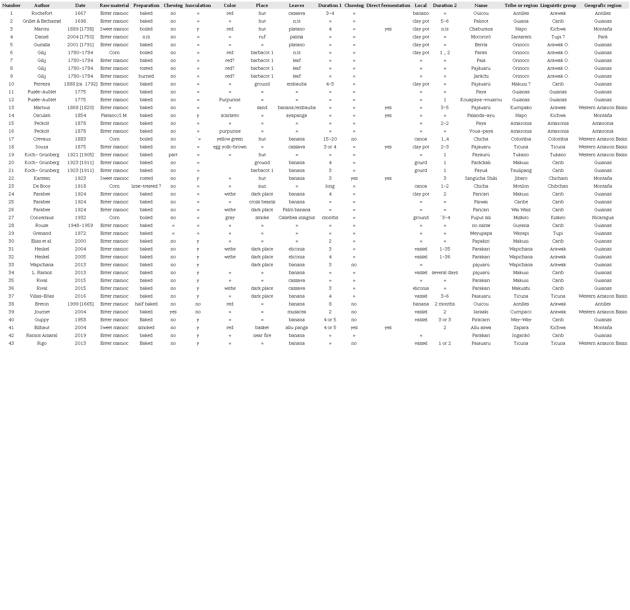 In the context of a broader study of South America’s fermentation practices, the author carried out extensive research using large reference texts, such as Steward’s “Handbook of South American Indians” (1948-1959), Murdock’s “Atlas of World Cultures” (1981), and Roth’s An “Introductory study of the arts, crafts, and customs of the Guiana Indians” (1924), and Roth (1929) looking for processes that could be identified as amylolytic fermentation. Once the occurrence had been identified, access to the original source of the information, in the original language when possible, provided a more detailed description of the process. When this article was practically ready, it was possible to find Erikson’s anthology of recipes of South American beers “La pirogue ivre. Bières traditionnelles en Amazonie” (2004) (which was also recommended by two peer reviewers), in which 6 additional occurrences of amylolytic fermentations were encountered. Some of the information was extracted from texts not quoted in these volumes.